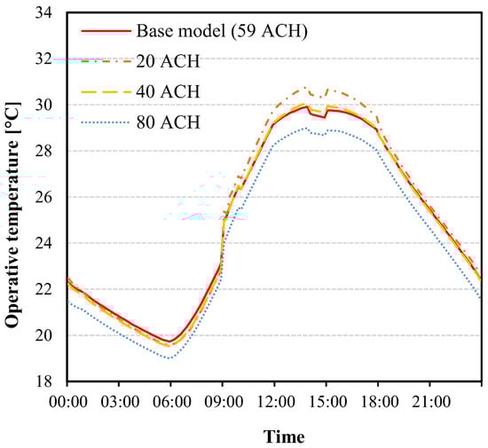 The only way to keep an indoor environment cool in the absence of temperature or humidity control and prevent overheating is by providing natural ventilation []. Sufficient airflow can ensure good ventilation in indoor spaces, such as classrooms, depending on building orientation and window position. This makes the students feel more comfortable and maintains indoor air quality by increasing wind speed during school hours []. In the base model, 59 ACH was used for natural ventilation, which is the average ACH value for the classroom estimated in our previous study []. However, the time-variant ACH was estimated, and the range of ventilation for the classroom was 47.8–99 ACH. A numerical simulation method was developed based on the transient mass balance to estimate the ACH. Such high ventilation is probably due to the buoyancy effect and size of the room. The heat generated inside the classroom is not only due to solar radiation but also from the students, and this results in a temperature difference inside the classroom indicating that there is an effect of buoyancy in addition to cross ventilation. The air heated by the bodies of students, which is less dense and creates low pressure, rises and escapes from the window located at the upper part. The cooler air is sucked from the opening below or from the window on the opposite side from outside. This effect must have led to the high ACH. According to one study [], different heights of windows at different positions create a significant buoyancy effect on ventilation, resulting in higher ventilation. They found that 45% and 100% of openings on opposite sides at different heights had a higher ACH. Furthermore, when the window openings are stacked one over the other, there is a greater chance of an air current short circuit occurring. This may create a high ventilation rate without sufficient mixing of the outdoor air throughout the room.