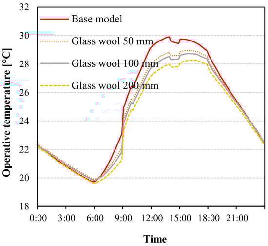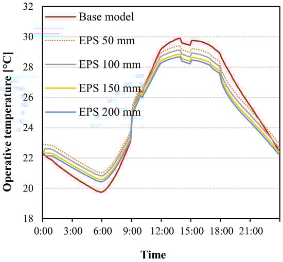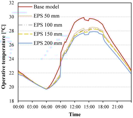 Thermal insulation plays an important role in changing the rate of heat flow through it, either by hindering conduction, convection, or radiation, based on the heat storage capacity of the materials. Proper selection of materials helps to avoid heat loss or gain and reduces the demand for energy. Insulating materials, such as expanded polystyrene (EPS), extruded polystyrene (XPS), and polyurethane-polyisocyanurate (PUR-PIR), are mostly used because of their low thermal conductivity, low cost, ease of handling, and installation []. Ali and Al-Hashlamun [] investigated the effect of insulation on uninsulated old schools and thermally insulated new school buildings. They found that the new insulated school effectively contributed to reducing the average indoor air temperature. Through a literature review, Sadineni et al. [] found that the use of thermal mass is more significant in reducing the indoor temperature in places where the night and daytime outdoor air temperature differences are high.