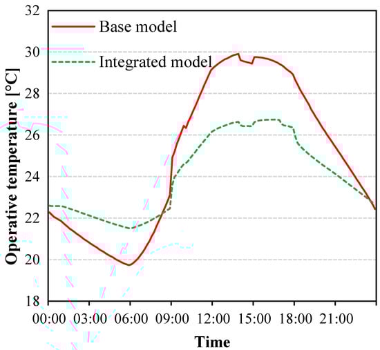 Simulations were performed for one week, but for the purpose of validation and analysis, we focused on one day in this study as a representative example. As shown in Figure 10, environmental measurements were taken continuously starting on 29 May, and the devices were allowed to adjust to the classroom environment for a week. From 30 May to 4 June, and on other days, the maximum temperature was approximately 29 °C. Therefore, we chose June 4th as the hottest day for further analysis and validation. Furthermore, on 4 June we observed a high accuracy of the simulated operative temperature with the measured globe temperature among the simulated days. The base model was validated using the measured globe and operative temperatures simulated using the simulation results of zone 3. The simulation was performed for multiple days, but the simulated temperature on 4 June was used for the model validation. Figure 11 shows the variation and relationship between them for a given day. Good agreement was found between the measured globe temperature and the simulated operative temperature, with a correlation coefficient of 0.96. The RMSE value was 0.074 °C. A mean absolute error (MAE) of 0.70 °C with a standard deviation of MAE of 0.55 °C was found, which shows the reliability of the simulated operative temperatures. Furthermore, the good agreement, with an average percentage error of 2.8%, is comparable to previous studies []. This confirms that the base model is applicable for investigating the operative temperature according to the passive design.