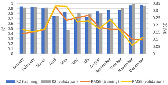 In this section, the case study results from the implementation of the methodology are presented. First of all, the monthly operation surrogate models of the thermal system are exhibited. More specifically, the first surrogate model expresses the correlation between the thermal system monthly energy consumption and optimization parameters. On the other hand, the second surrogate model expresses the correlation between the thermal system monthly DHW load coverage and optimization parameters. Table 3 and Table 4 show the coefficient values of the surrogate models based on Equation (5) for each month of operation. At the same time, the training results of the monthly operation surrogate models of the thermal system are displayed in Figure 4 and Figure 5. It is noted that for the current case, 75–25% training-to-validation data size ratio was employed. It is also worth reminding that the data were derived from the operation simulation of the thermal system. Each surrogate model training–validation process needed a small amount of computational time (about 0.5 s).