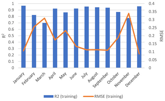 It can be discerned from Figure 4 that monthly thermal system consumption surrogate model training had decent performance results. Fitting accuracy appeared to decrease during summer semester. This might mean that seasonal environmental conditions affect fitting accuracy. More specifically, there was a much larger operation result variation among different parametric scenarios of the solar-assisted geothermal heat pump case. In addition, according to Figure 5, the DHW load coverage model appeared to be mostly accurate, with its accuracy declining during a major part of the winter season.