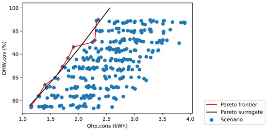 Building a Pareto frontier surrogate model enables the user to demand a criterion to be set at a certain value to obtain the optimal value of the second criterion. For example, if the model user states that their optimal system should cover at least 95% of the DHW load demand on a monthly basis, the Pareto surrogate model returns the minimized (optimal) energy consumption for this case. This procedure is repeated for every month of the year, so the user receives the optimal paired criterion values for an annual operation of the thermal system.