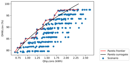 Finally, Figure 7 and Figure 8 exhibit the Pareto frontier along with its respective surrogate model in order to grasp a more practical understanding of the Pareto frontier surrogate models. As can be seen, the solutions forming the Pareto frontier were equally optimal for the optimization objectives (geothermal heat pump energy consumption and domestic hot water coverage). Moreover, they were superior to all the other solutions not belonging to the monthly Pareto frontier. Therefore, these are the solutions that should interest the user during a design process. However, the objective performance of all parameter combinations used are not available to the user, which is why the Pareto frontier surrogate models need to be employed.