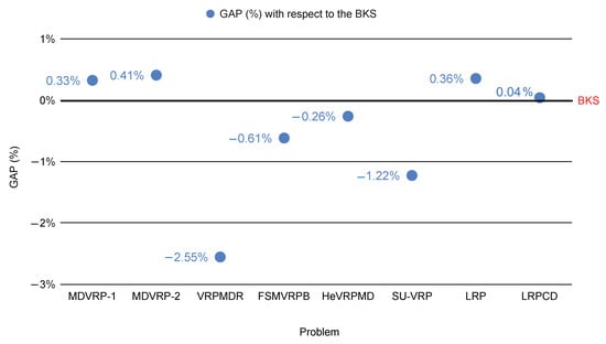 Researchers have defined some NP-Hard optimization problems in mobility and transportation problems in smart cities. We have selected some publications related to these problems in which the solution approach is based on the intelligent x-heuristic algorithms. Specifically, we have focused on solution approaches that use biased-randomized heuristics, because they can solve large-scale optimization problems, providing ‘good’ quality solutions in reasonable computing times. Table 3 lists the eight selected optimization problems, their acronyms, and the publications in which the problems were solved. In addition, Table 4 documents the solution values found for the problems in Table 4. The solution values are tabulated as (i) the problem best-known solution (BKS); (ii) the solution reported by the authors (OBS) of the selected publication; and (iii) the percentage gap between the BKS and the OBS with respect to the BKS. Figure 2 depicts a summary of the tabulated results for the problems; the vertical axis represents the calculated percentage gap. According to the results, algorithms based on biased-randomized heuristics provide a competitive performance for all the selected problems, improving the BKS by about −0.44% on average, varying from about % for the LRP up to −2.55% for the VRPMDR. In particular, to solve the former problem, the authors use a simple but effective constructive biased-randomized heuristic.