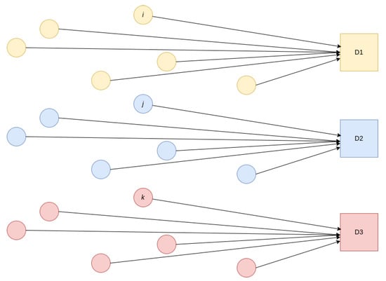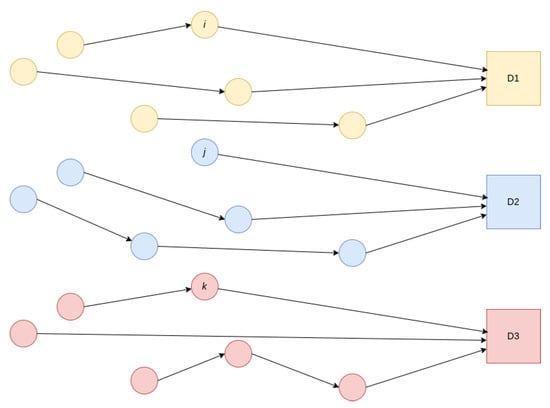 This section illustrates the benefits that can be achieved by expanding ridesharing practices in urban areas. We consider a typical scenario in which citizens departing from multiple origins wish to reach certain common destinations by a target time. Thus, Figure 3 shows a simple example of such a scenario, where a vehicle departs from each source node (circles i, j, k, etc.) and has to be in its associated destination (D1, D2, or D3). In addition, we will assume that each route cannot exceed a maximum travel time .