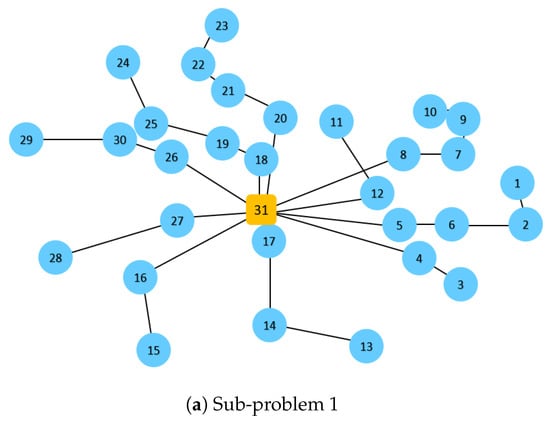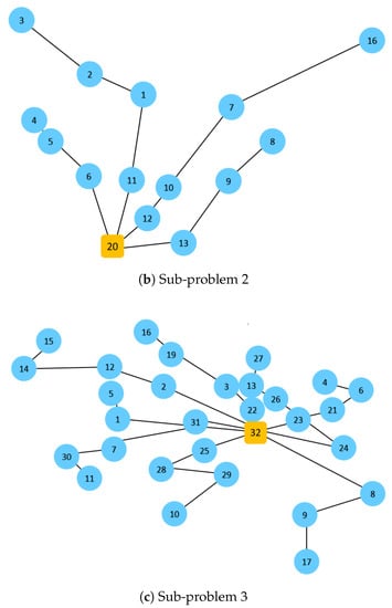 The questions are then: how many vehicles are really necessary to provide the same mobility service? What is the reduction in distance (and, hence, in energy consumption) that can be obtained if the operations are optimized? In order to illustrate how intelligent algorithms can contribute to answer the aforementioned questions, a case study regarding multiple sources and three different destinations is considered and solved using an adapted variant of the algorithm proposed in the study by Panadero et al. [105] for the deterministic version of the team orienteering problem. The algorithm was adapted to take into account that there is a maximum occupancy level per vehicle and the fact that the final solution has to cover all nodes while still respecting the maximum traveling time per route. Python was used to implement and run the proposed algorithm, and we run experiments on a workstation with an Intel(R) Xeon(R) processor at GHz with 64 GB of RAM memory. In our experiment, we used three small instances from the well-known team orienteering problem benchmarks proposed by Chao et al. [106]. These benchmarks consist of 320 instances, belonging to 7 different subsets. An instance name follows the nomenclature ‘pa.b.c’, where ‘a’, ‘b’, and ‘c’ refer to the subset number, the number of available vehicles, and the specific instance under study, respectively. In this work we have selected the instances p1.4.k (subproblem 1), p2.4.k (subproblem 2), and p3.4.k (subproblem 3) to illustrate the benefits of ridesharing strategies. Notice that the aggregation of these three instances (subproblems) lead to a multi-source and multi-destination team orienteering problem, thus emulating the scenario represented in Figure 3. In fact, the aforementioned scenario is obtained when the single origin in each subproblem is connected with each of the circular nodes in the subproblem and the traveling times of these connections are set to 0. In our computational experiments, we have assumed that the capacity of each vehicle is 4 passengers. Table 5 shows the parameters assumed in each sub-problem and the final results obtained for both the individual and the ridesharing mobility strategies. The total time-based costs (total time traveled) obtained for the ridesharing (collaborative) strategy are , , and , respectively. In the individual (non-collaborative) strategy, the total costs obtained are , , and , respectively. As the percentage gap column shows, even in a small-sized instance such as the one considered, the gains can be noticeable.