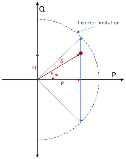 Usually, the configuration of the BESSs is used to provide active power in the electric system [7]; however, they can also be used to deliver reactive power [53]. In [54], a real application is presented in a microgrid to verify the performance of BESSs providing active and reactive power. The results indicate a better performance when both operation modes are implemented. The study conducted by [55] considers smart inverter functions and takes into account the real operation of an electrical system, determining reactive power injection or absorption from the grid. In this sense, this strategy provided reduced losses, alleviated the power curtailment, and improved home profits. In [56], the smart inverter controller is recommended to deal with short-term transients. Most BESSs are adjusted to operate based on the voltage/Var function [25], which means that they provide a certain amount of reactive power depending on voltage limits. In these cases, the smart inverter does not inject any reactive power if the voltage limits stay between 0.95 to 1.05 p.u. If the voltage is below 0.95 p.u., the inverter operates in capacitive mode; otherwise, when the voltage is above 1.05 p.u., it operates in inductive mode. In this work, the smart inverter is adjusted to control the active and reactive power dispatch, considering its limitations, as illustrated in Figure 1. When the inverter operates with a Power Factor (PF) other than one, a part of the active power is cut to supply reactive power. The control is carried out aiming to optimize the operation of the grid.