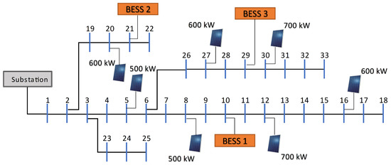 To spot the relevant literature, a search and later filtering were carried out in Science Direct and IEEE databases using as keywords “storage systems”, “PV and BESS”, “WPG and BESS”, “MOPF” “power losses”, and “BESS in distribution systems”. Only peer-reviewed and high-impact papers were considered in the filtering. Numerous studies have been carried out regarding the implementation of BESSs, PV, WPG, and other sources in distribution networks [18]. Such studies take into account aspects that include optimization [6], planning [19], operation [20,21], and management of electric distribution networks [22]. In [23], the authors propose a methodology to find the optimal number, location, and size of BESSs, with the objective of avoiding over and under-voltages in distribution grids. A heuristic approach is used to place the storage systems, and a MOPF is applied for the sizing problem. Two distribution systems are used: a 34-bus test system and a real Italian low-voltage power grid. The authors of [24] proposed a Grey Wolf Optimization (GWO) algorithm for optimal placement of energy storage in distribution systems with DG. The storage sizing is designed based on load profiles and convenient peak shaving; simulations are carried out using a 34-bus test system, and a comparison is performed with a Genetic Algorithm (GA) approach. In [22], the authors develop a Modified Imperialist Competitive Algorithm (ICA) that coordinates the operation of BESSs, PV, and diesel generators within a 24-h time horizon. The energy management approach proposed by the authors seeks to optimize the charge and discharge of BESSs to minimize operating costs. The authors carry out several tests in the IEEE 33-bus test system considering power flow constraints as well as voltage and current limits. In [25], the authors propose an optimal reactive power control approach that aims to enhance the PV hosting capacity of distribution networks with BESSs. The main objective consists of determining the optimal size, dispatch, and control setting of the Volt/VAr function of smart inverters for PV and BESS units. For this, the optimal location of such devices is also considered. The maximization of the PV hosting capacity is modeled as a mixed-integer nonlinear programming problem also considering the minimization of voltage deviation in the network. A bio-inspired metaheuristic known as Slime Mould Algorithm (SMA) is implemented to solve the optimization problem.