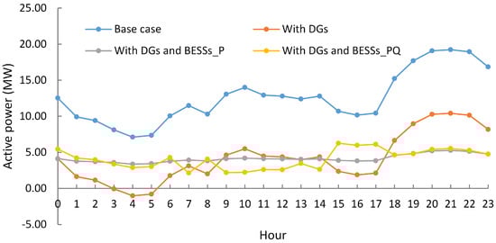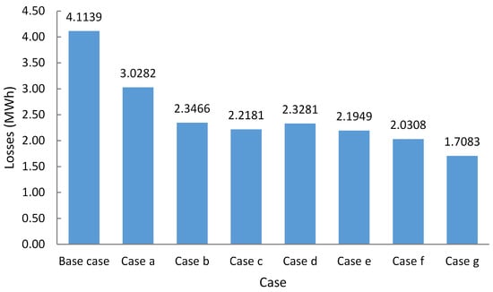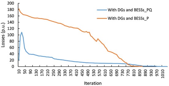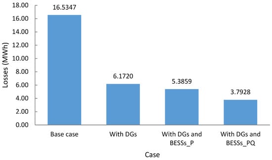 An important element of renewable sources and the proliferation of devices such as BESSs bring several operational challenges to modern distribution grids. In most studies, BESSs are predominantly used for ancillary services [53] or integrated with DG [6,20]. Only a few studies recognize the minimization of power losses by means of integrating BESSs with other generation resources [70].