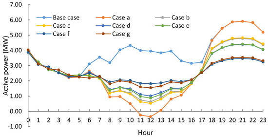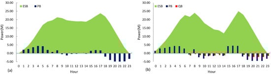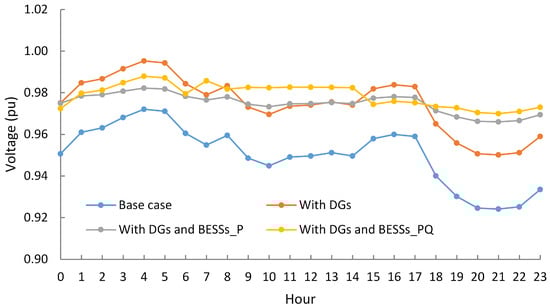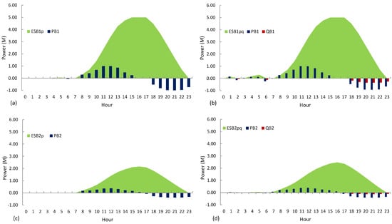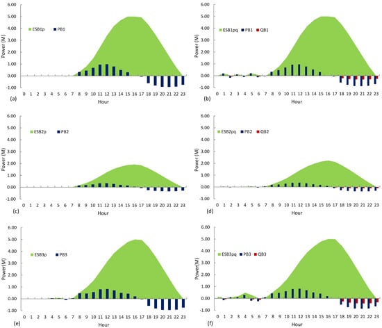In [25], the BESS is applied to reduce total active power losses for the best operation of the electrical system. When BESS is charging, the inverter works with a PF equal to 1. When BESS supplies energy to the grid, the power factor can vary within specified limits, allowing both active and reactive power to be injected to the grid.