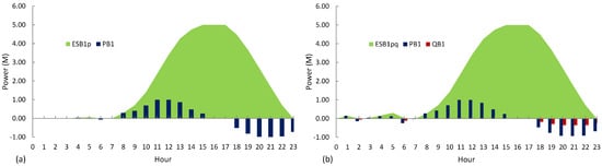 The BESS model describes the charging and discharging of the battery. In this case, a linear model is used, where the charging and discharging efficiency values are considered as presented in [20], which is adjusted through the parameters and , respectively. The BESS model can be expressed by Equation (4)