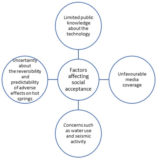 Figure 1 summarises some of the most crucial factors impacting social acceptance. The experience from initial geothermal projects has shown that such initiatives did not have high levels of social acceptance, which is a trend common across renewable energy investments [20,21].