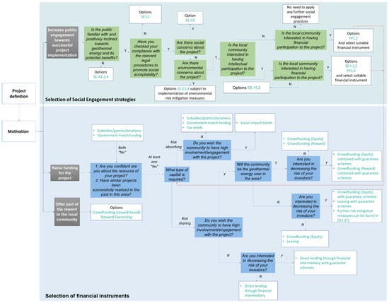 This paper presents a DT framework through a step-by-step approach, assisting investors/promoters of geothermal energy projects to select public engagement strategies, alternative financing solutions, and risk mitigation measures (or options) for geothermal energy projects. The decision tree is presented for the project definition and operation phases, as the options under these two phases differ substantially. Encouraging stakeholder involvement and promoting engagement of stakeholders (citizens, local authorities, associations, etc.) already in the early stages of a renewable energy project has been widely cited in literature [7,13,14,15], while the project definition and exploration phases of a geothermal project have been cited to have the highest risk of project failure [16]. As far as financial options are concerned, these are also quite different across the two phases; during operation of the project, resource risk has been mitigated and certain financial options become available, such as leasing or bank loans [16,17].