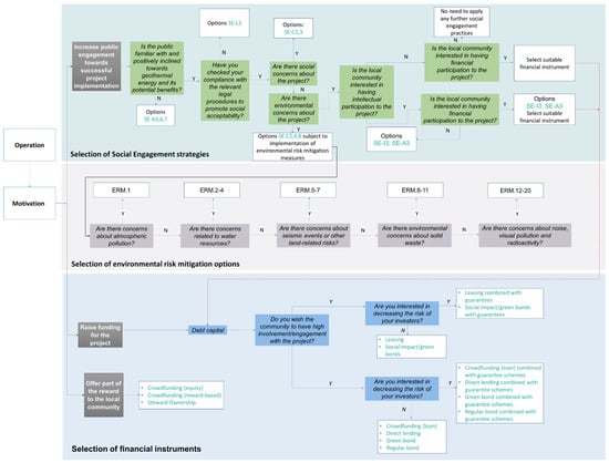It is important to mention that the type of geothermal energy technology is also a determining factor in choosing the most appropriate social engagement strategy, financial instrument and, most importantly, environmental and other risk mitigation measures. Environmental concerns associated with geothermal energy projects differ substantially among deep and shallow geothermal systems; for example, induced seismicity is a risk associated with deep geothermal projects. Environmental concerns for shallow geothermal (<500 m, such as horizontal closed-loop heat exchangers) are commonly less major and may mostly involve concerns about groundwater contamination due to the concentration of bacteria and leakage of additives and other compounds to aquifers due to potentially poorly sealed boreholes [61]. Incorporating technological characteristics would, however, largely increase the complexity of the tool as it would require technology-specific information about the impact of the technology type on social and financial factors, shifting the focus from the integration of social, environmental, resource risk, and financial characteristics, which is the scope of this paper. Rather, this tool offers an overview of the spectrum of factors (and their meaningful sequence) that a developer/promoter of geothermal energy should consider towards achieving a successful outcome. Nevertheless, the DT can offer shallow- vs. deep-geothermal-specific information on environmental risks and risk mitigation options, as shown in [61].