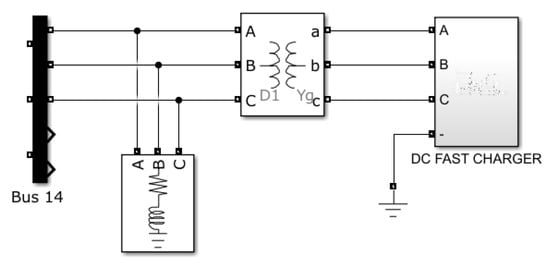Existing loads are also fed through the 6th bus, from which the EV fast charger receives energy. The same work was applied to 14-bus and 30-bus systems. In these systems, EV fast chargers are connected to bus 14 and bus 30. Connections are shown in Figure 3 and Figure 4.