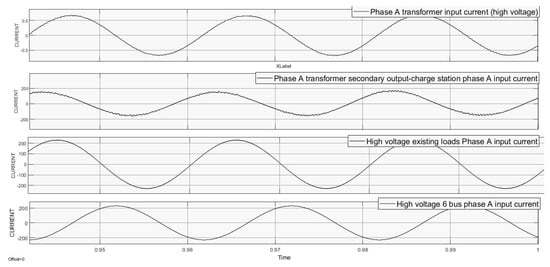 When the model is run, the current signal at the A phase input in the primary of the transformer, the phase A current signal at the secondary output, the current signal at the A phase of the loads fed from the 6th bus, and the phase A current signals at the 6th bus input were examined. These signals are shown in Figure 5.