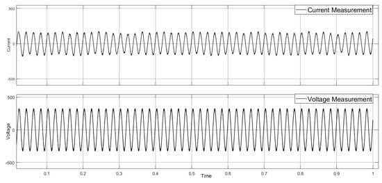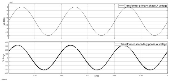 The charging station receives AC energy from the rectifier input. In addition to the current signals in Figure 5, the current and voltage signals at the rectifier input are shown in Figure 6. Transformer primary and secondary A phases voltage signals are shown in Figure 7.