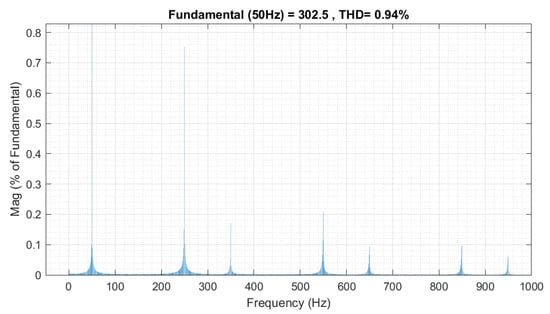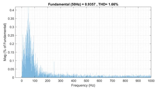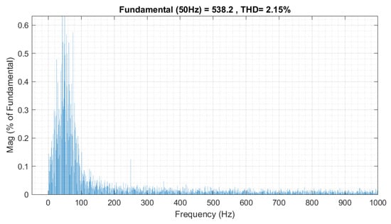 Another point that draws attention in this study is the differences in the current signal drawn from the grid while charging electric vehicles with different occupancy rates. The EV far charger designed in this study also has a state of charge control. It is observed that the harmonic distortions occurring in the high current time in the EV charging cycle increase more in the low current time; that is, when the state of charge exceeds 80%, the distortions on the current signal increase. In the harmonic spectrum analysis shown in Figure 8, THD is 1.51%. While performing this analysis, the battery charge rate of the electric vehicle was set as 30%. In this case, it is charged with a 125 A current. On the other hand, with the FFT spectrum seen in Figure 18, the battery charge rate is set to 90%. In this case, the EV charging current decreased to 20 A. This is a method applied for battery health management.