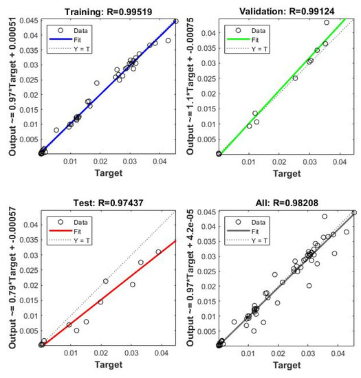 ANN (artificial neural network) consists of several layers: according to Figure 16, these are the input layer, the output layer, and the number of hidden layers to be determined in the ANN. The data in the input layer in the structure created here include bus numbers, EV DC charger numbers, and the years of this data. The output layer is taken as the transformer primary current THD, transformer secondary current THD, transformer primary voltage THD, and transformer secondary voltage THD. With the network structure created with neurons trained with this information, predictions can be made on the effect of EV chargers on the network for the following years. While training, 75% of the data was used for training and 25% of the data collection was used for validation. With the network structure created with neurons trained with this information, predictions can be made on the effect of EV chargers on the network for the following years. For IEEE 6, 14, and 30 bus systems, these points are the 6th bus in the 6-bus system, the 14th bus in the 14-bus system, and the 30th bus in the 30-bus power system; up to 50 charging stations have been connected, increasing over the years. By running the system in simulation, spectra were created by FFT analysis. Output spectra are transformer HV primary THDI, THDU transformer LV secondary THDI, and THDU values. Linear regression analysis of the artificial neural network is shown in Figure 17.