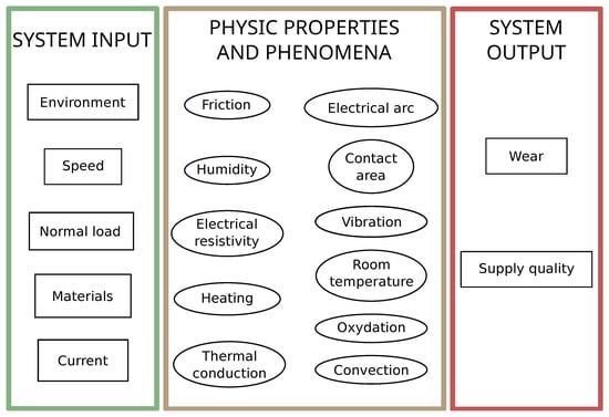 Studying systems with SEC remains difficult because of the great number of properties and effects that have to be taken into account. Figure 2 lists the parameters, inputs, and outputs of an ideal experimental bench. The physical properties and phenomena depend on inputs but are also interlinked. Thus, some of these properties and phenomena have an indirect impact on the wear and the power supply quality.