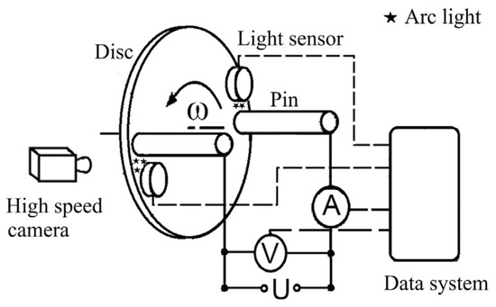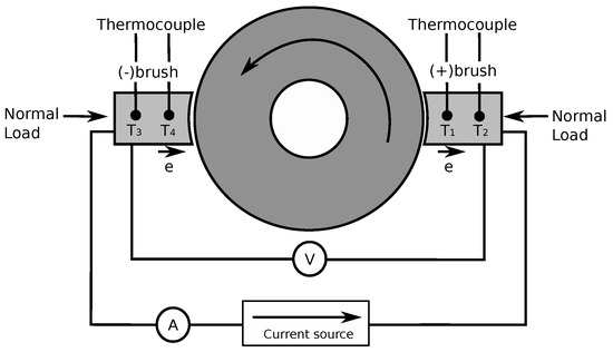 (In Table 1, see column 1 for the article by Zhang Y. [29] and column 2 for the article by Yang Z. [31]). A copper disc rotates against two pins made of the same materials. A current flows out of a pin through the disc sample and goes back from the other pin (see Figure 3). The current is alternative (125 Hz or 50 Hz) and can reach 300 A. Sliding speed is set to a maximum of 28 m·s.