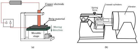 As shown in Figure 6b, two horizontal crossed cylinders are used to investigate a sliding electrical contact. A spring applies a 10 N normal load between the cylinders [6]. An electrical current of 5 A flows through the electrodes, with the upper electrode as the cathode and the lower as the anode. Those electrodes are 20 mm high and 10 mm in diameter. A vibrator moves the lower electrode at a 5 mm amplitude and with 3 Hz frequency. The four-point probes method is used to measure voltage drop and current. These values allow for calculating the contact resistance more accurately without taking into account contributions by wires and other contact points. Contact resistance is then observed during a test. In an article by Grandin M., three different carbon-impregnated Cu are studied and mounted on the moving part (anode), whereas the stationary part (cathode) is made of copper. These tests are repeated for reproducibility regarding the specific wear rates and the friction coefficient.