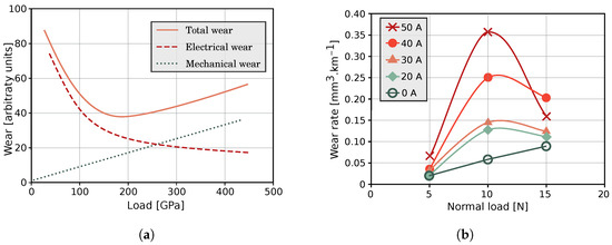 Regarding electrified contacts, most results show that increasing the normal load between materials decreases the wear rate [34,41,55,56,57,58], the contact heating [34,35,41,57], and the friction coefficient [40,41,56]. First, this is due to the power loss into the contact point due to Joule effect: