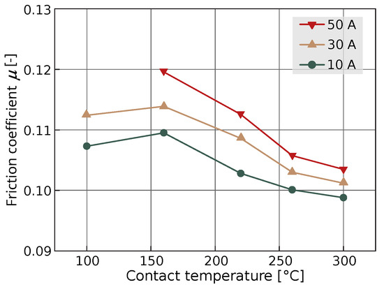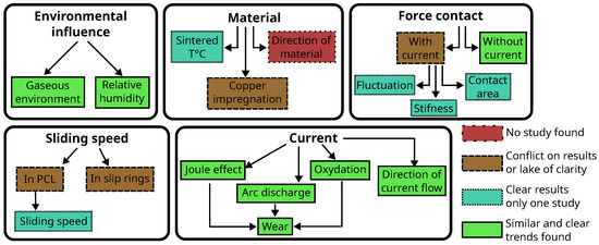This discussion is a comparison of the different experimental results obtained by scholars. As the test bench and test conditions are all different, the trends of the outputs (friction coefficient, temperature, wear) are listed depending on five major inputs: the environment, the material, the normal load, the sliding speed, and the current.