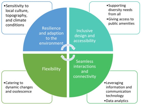 Figure 1 illustrates four main principles of the framework of human-centric solutions: (i) resilience and adaption to climate change, (ii) inclusive design and accessibility, (iii) flexibility, and (iv) seamless interactions and connectivity. The framework intends to enable a human-centric transition in the built environment to increase its ability of resilience and adaptation to the climate change. The sustainable built environment must be sensitive to local topography, culture, and climate conditions for improved resilience. Adaptation strategies should be considered by identifying risks and critical elements for necessary adjustments in the built assets. Human-centric solutions would enhance the capacity of communities to cope with challenges and mitigate the fallouts of climate change. Provisions are in place in sustainable buildings to accommodate likely technology advances and people’s evolving lifestyles without significant decommissioning costs. Concepts such as design or disassembly, deconstruction, and recyclability are incorporated as a sustainable strategy to enhance the reusability and recyclability of buildings and infrastructure projects. These innovative waste management strategies can reduce the landfill burdens and carbon footprints, but more importantly, they also provide potential savings on disposal fees and demolition costs.
