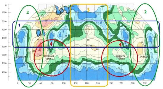 A scan of the refractory lining. 1—The zone of the slag belt; 2—Loading zone; 3—Drain area; 4—Trunnion zones.