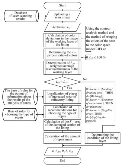 - For the given input variables {Sector, c, Li,j}, it is necessary to determine the percentage of colors on the converter lining scanogram, the wear rate degree, the converter lining condition, the type of repair work (if necessary) {LAV, R}, calculate the indicators of the converter lining damaged sections {S, mR}, and issue recommendations on the start of the process. The obtained estimates of the average residual thickness of the working converter lining, area, volume, and dislocation of places of increased local wear of the lining during the campaign allow us to determine the patterns of destruction and analyze the quality of the refractory converter lining.