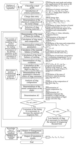Thus, the purpose of this work is to increase the efficiency of reconfiguring the converter control system by creating a computer system that allows, on the basis of a library of mathematical models, one to issue recommendations to control production personnel on resource and energy saving control the converter steelmaking process. This goal is due to the need to increase the life of the refractory converter lining while meeting the requirements for the quality of finished products, energy consumption, and waste capacity of production.