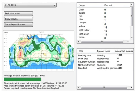 The process of converter melting begins with an inspection of the surface of the converter lining and a decision to restore its operability if necessary [48,49,50]. The localization of increased wear areas of the refractory lining consists in searching for sections, the residual thickness of which is less than the average value obtained. The assessment of the identified areas volume of increased local wear of the lining is carried out using the analysis of scanograms. The scanogram is an expanded image of the working lining. The residual thickness of the working lining is encoded in the form of a color scale, as shown in Figure 1. Cold shades, starting from blue, mean an unchanged starting thickness of the refractory, warm shades up to red indicate areas with extreme wear of the working lining to zero residual thickness of the working periclase-carbon layer. The obtained results of pixel integration of scanograms allow us to determine the necessary consumption of repair materials, taking into account the real scale to the converter lining, during hot repairs by semi-dry, flare shotcrete, or welding.