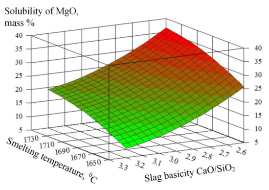 Figure 7 shows the dependence of the approximate solubility of MgO on the smelting temperature and basicity of the slag (at constant oxidation FeO = 25% by mass.).