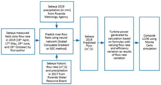 To size a small RoR hydropower plant for any river, a time series flow rate of the river is needed. However, the only available historical consistent flow rate of the Sebeya from a Rwanda Water Resource Board was from 2017. By 2019, historical flow rate data was inconsistent or missing for the Sebeya river. There the report from 2017 was the best method for predicting, given that the lack of data is a real issue for other sites. Machine learning is being used in different approaches to help forecast energy generation, and improve the operation, design, and maintenance of hydropower plants. Among other applications, it has been implemented in the optimal dispatch of hydropower plants based on head and river flow [23], to assess hydropower reliability due to climate change [24,25], reservoir water level forecasts [26], and to help mitigate silt erosion in the hydro-mechanical components of the plant [27]. Yang et al. used a deep learning method to predict hydropower generation at small plants based on historical precipitation data provided by weather stations with 93% accuracy, [28]. However, access to reliable and consistent data often remains a challenge in such studies [29]. This study used the Sebeya 2019 precipitation from the Rwanda Meteorology Agency, available Sebeya flow rates from 2017 (provided by the Rwanda Water Resources Board) since there were no historical consistent flow rates of the Sebeya for 2019, and Sebeya field visit measurements conducted in 2019 (19 April 2019, 17 May 2019, 29 June 2019 and 20 August 2019). Using these data, machine learning was used to predict the Sebeya flow for the observed weather conditions in 2019, a timeframe where near-continuous meteorological data was available for the watershed area of the river. The methodology used is shown in Figure 1.