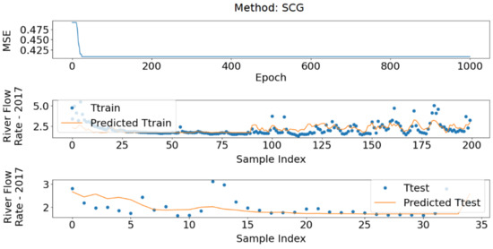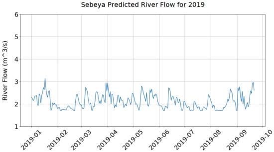 The training and error functions were selected to retain the extreme flow events, which are observed on the river following major rainstorms. One example of a predicted river flow rate is shown for 2019 in Figure 3.