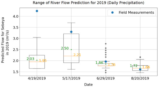 As noted earlier, limited river flow rate data was available, and the data available had substantial periods with no, or suspect, flow readings. Therefore, to provide a limited ‘spot check’ of the model, the first author measured the river flow at a power plant located on the river on four dates: 19 April 2019, 17 May 2019, 29 June 2019, and 20 August 2019, resulting in measurements of 4.24 m3/s, 3.3 m3/s, 1.96 m3/s, 1.61 m3/s, respectively. A simple measurement process was performed: Timing the movement of a float on the surface of the river, measuring the cross-sectional depth of the river, and applying appropriate hydraulic calculations. We compared these data to the distribution of results for the measurement days, as shown in Figure 5.