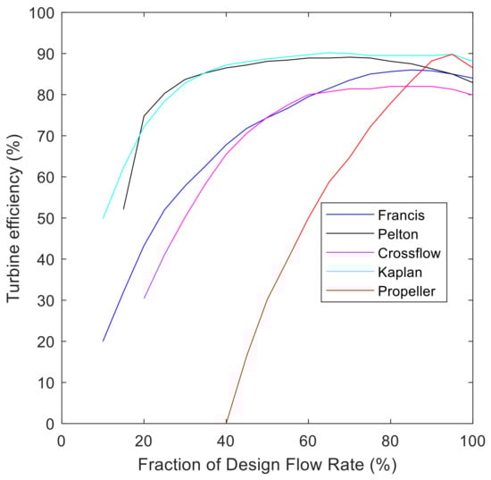 Turbine efficiency for each turbine type was estimated by digitizing a generic turbine efficiency chart [33] that provided the efficiency at flow rates relative to the designed flow rate of the turbine. Data is valid from 5–100% of the designed flow rate, and digitization was conducted at an interval of 5%, see Figure 6.