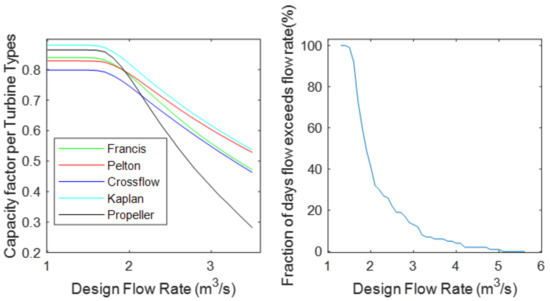 It is also observed that the capacity factor for all the turbines is flat up to 1.7 m3/s because there is an increasing power in the water flow at near-constant turbine net efficiency, which maintains the power produced at the designed power plant capacity. In contrast, the capacity factor drops at designed flow rates above 1.7 m3/s as the number of days with available water at the designed flow rate drops off rapidly above 1.7 m3/s—as shown by the right panel in the figure—and the plant is operating below the designed capacity, and at reduced efficiency, for an increasing number of days per year as the designed flow rate increases. As can be seen from the figure, the drop in the capacity factor is closely aligned with the knee in the flow exceedance curve. Therefore, it is reasonable to expect the optimal LCOE at or near that flow range.