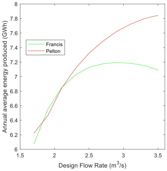 From Figure 8, for both turbines the annual average energy produced from the designed flows of 1.7 m3/s to 2.9 m3/s increases monotonically as a result of the increasing water flow rate at similar high-operating efficiencies. Above a designed flow of 2.9 m3/s, the annual average energy produced by the Francis flattens and then decreases as the increased power in the water flow cannot make up for the decreased turbine efficiency—the turbine is operating below its designed flow rate for substantial fraction of the year. The Pelton turbine, in contrast, continues to increase as it has a flatter efficiency curve resulting in a flatter power production.