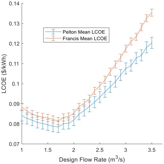 The LCOE ($/kWh) for Francis and Pelton at varying designed flow rate (m3/s) and a constant head of 70 m. Error bars indicate 95% confidence intervals for each simulated LCOE point.