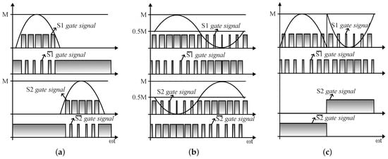 - Discontinuous single-phase leg switched modulation (DSPLS): one converter leg switches at high frequency, while the other switches at the rate of the fundamental cycle [17] (Figure 1c).