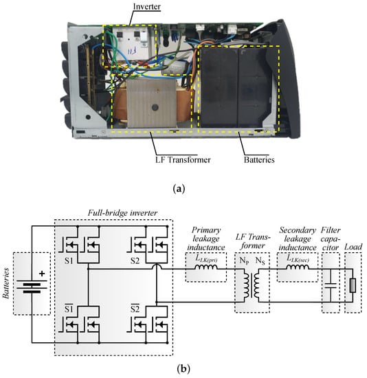 The developed methodology is applied to a commercial 1 kW line-interactive ferroresonant-based UPS, shown in Figure 2a. The backup mode equivalent circuit is shown in Figure 2b. The RMS output voltage is 120 V (60 Hz), and a pair of series-connected 12 V/7 Ah batteries (24 V) is used, with the possibility of adding external batteries to increase the current (Ah) capacity. The default MOSFET part number of the product is STP220N6F7 [29], with two devices used in parallel in order to reduce the current.