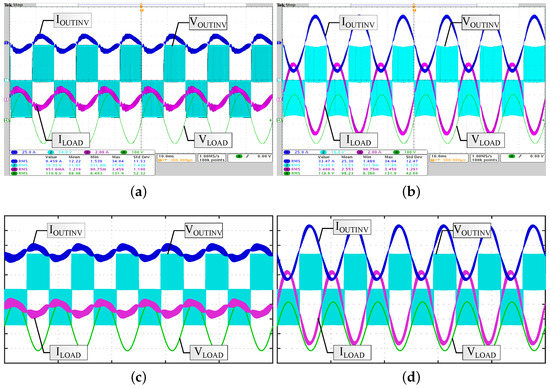 The UPS is simulated in Simulink, including the inverter topology, the modulation techniques, a model for the transformer impedance, and the resistances of the battery, connectors, and cables. To validate the simulated UPS, Figure 4a,b present the experimental waveforms of current and voltage at the inverter output, with loads of 100 W and 400 W, respectively. Figure 4c,d present the simulated waveforms for the same operation point. In this example, DM is used. The simulated and measured RMS values of voltage and current at the load and at the output of the inverter are compared in Table 1.