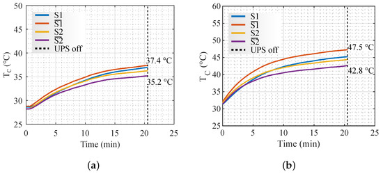 With the default battery bank of the commercial UPS (7 Ah),the batteries are discharged before the temperature of the MOSFETs reaches a steady-state condition. In order to increase the autonomy of the UPS, an Itech IT7900 programmable voltage source was used to emulate an external battery bank. The resulting MOSFET case temperatures () are shown in Figure 5a,b for the operating points of 400 W and 600 W, respectively.