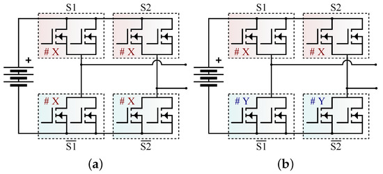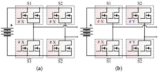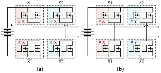 Inverter part number configuration for DSPLS. (a) Scenario where all MOSFETs have the same part number. (b) Scenario where different part numbers are considered for the different switching patterns.