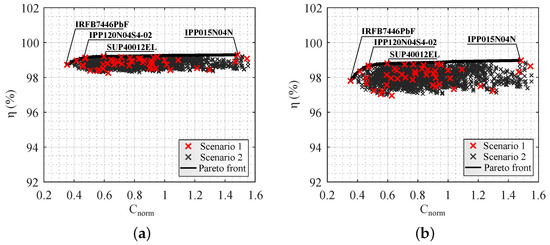In these, 2209 MOSFET combinations were evaluated. The Pareto front contains the optimal solutions for cost × efficiency. The part numbers on the front are shown in Table 3 and Table 4 for the powers of 500 W and 800 W, respectively, identifying the normalized cost (), efficiency () and junction temperature () for each transistor. The highlighted rows identify the solutions of scenario 1, which uses the same part number in all MOSFETs. These part numbers are presented in Figure 7.