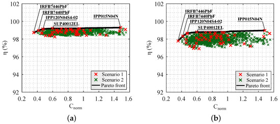 Pareto fronts for PS are shown in Figure 9. The red points represent the designs corresponding to scenario 1, and the green points represent the designs for scenario 2. The part numbers of the optimal solutions are shown in Table 5 and Table 6 for 500 W and 800 W, respectively. The highlighted rows represent the optimal solutions that use the same part number in all MOSFETs.