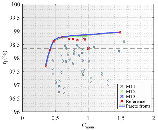 In the previous sections, the Pareto fronts for each modulation technique were presented as well as several solutions with better efficiencies and attractive costs when compared to the reference. Figure 12 shows the designs and Pareto fronts with the three evaluated modulations together.