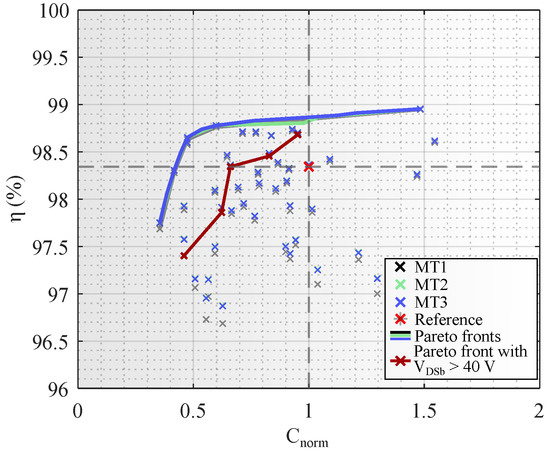 To evaluate the use of MOSFETs with higher voltage ratings, Figure 14 shows the solutions that use transistors with 40 V. The center point of the dashed lines represents the reference design, and the red line identifies the Pareto front for the transistors with > 40 V. All solutions presented a lower normalized cost than the reference. Table 11 shows the selected part numbers.